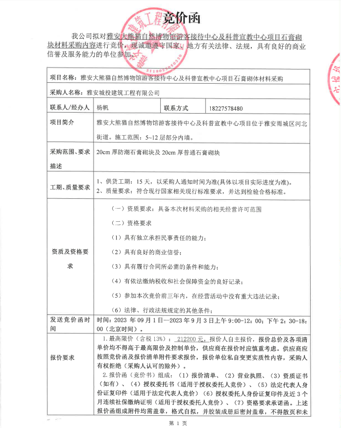 雅安大熊貓自然博物館游客接待中心及科普宣教中心項(xiàng)目石膏砌塊材料采購(gòu)內(nèi)容競(jìng)價(jià)公告