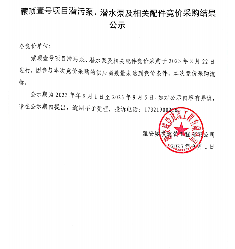 蒙頂壹號(hào)項(xiàng)目潛污泵、潛水泵及相關(guān)配件競(jìng)價(jià)采購結(jié)果公示