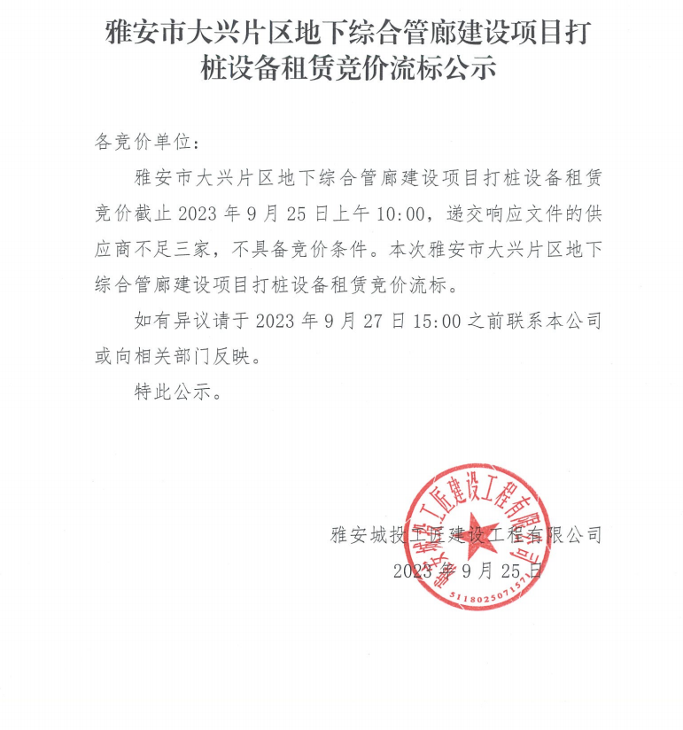 雅安市大興片區(qū)地下綜合管廊建設(shè)項目打樁設(shè)備租賃競價流標(biāo)公示