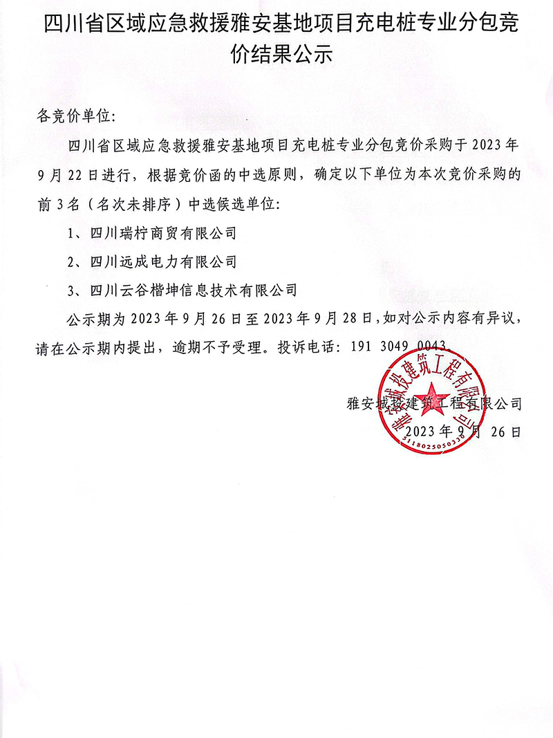四川省區(qū)域應(yīng)急救援雅安基地項(xiàng)目充電樁專業(yè)分包競(jìng)價(jià)結(jié)果公示