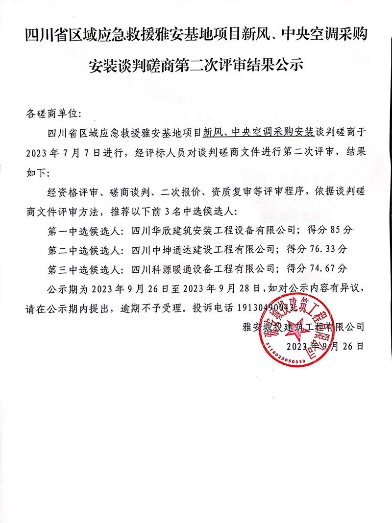 四川省區(qū)域應(yīng)急救援雅安基地項(xiàng)目新風(fēng)、中央空調(diào)采購(gòu)安裝談判磋商第二次評(píng)審結(jié)果公示