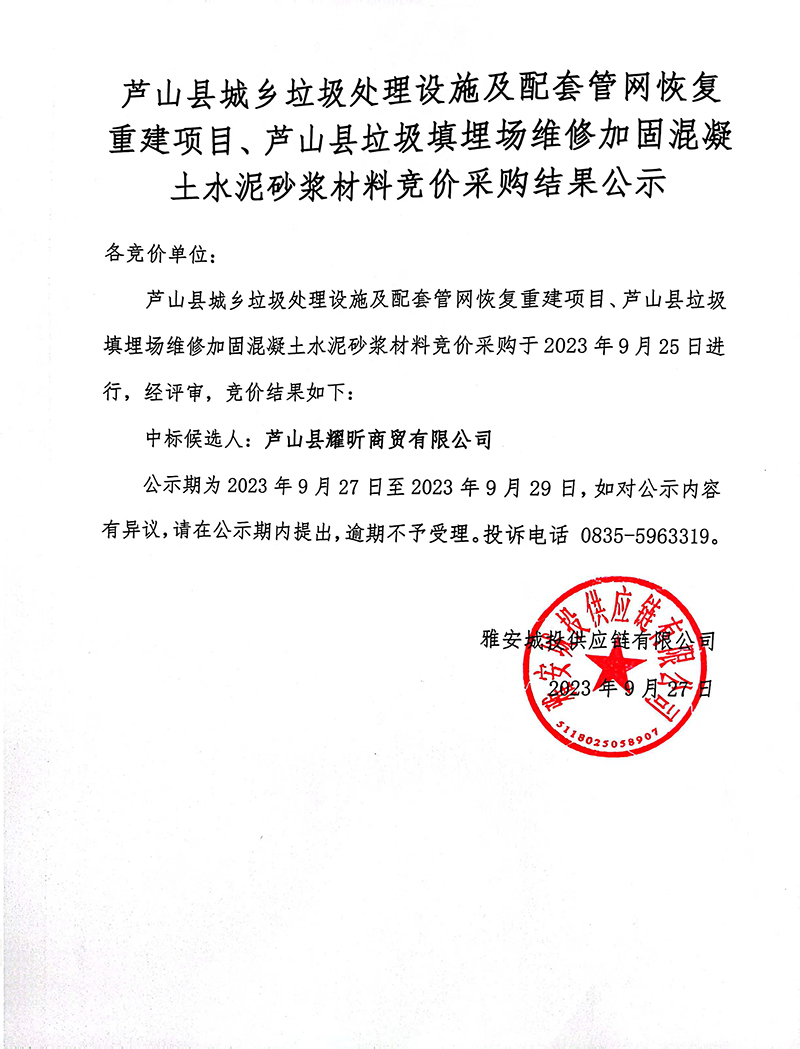 蘆山縣城鄉(xiāng)垃圾處理設(shè)施及配套管網(wǎng)恢復(fù)重建項目、蘆山縣垃圾填埋場維修加固混凝土水泥砂漿材料競價采購結(jié)果公示