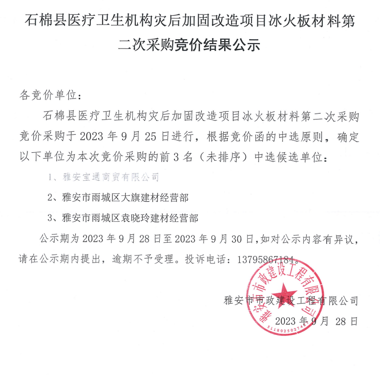 石棉縣醫(yī)療衛(wèi)生機構(gòu)災(zāi)后加固改造項目冰火板材料第二次采購競價結(jié)果公示