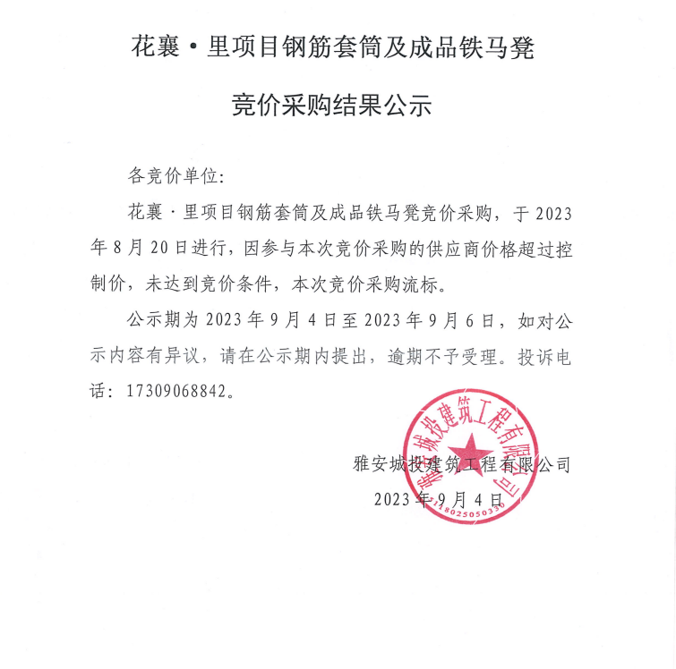 花襄·里鋼筋套筒及成品鐵馬凳競價(jià)采購結(jié)果公示