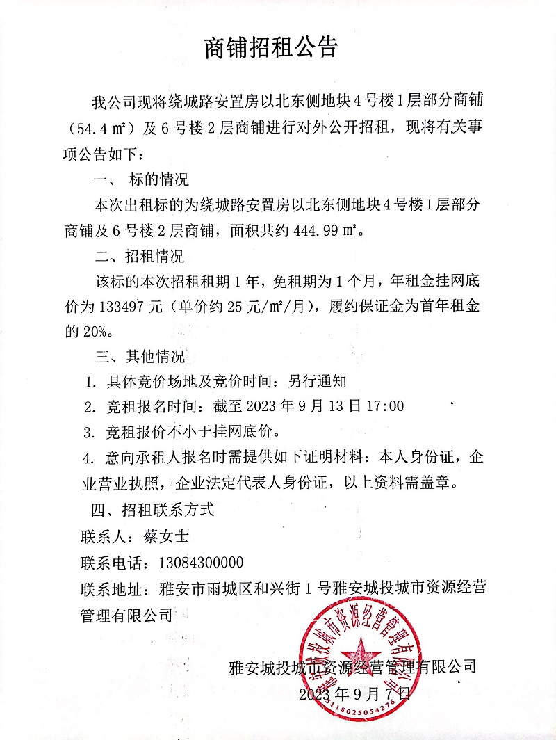 繞城路安置房以北東側(cè)地塊4號(hào)樓1層部分商鋪招租公告