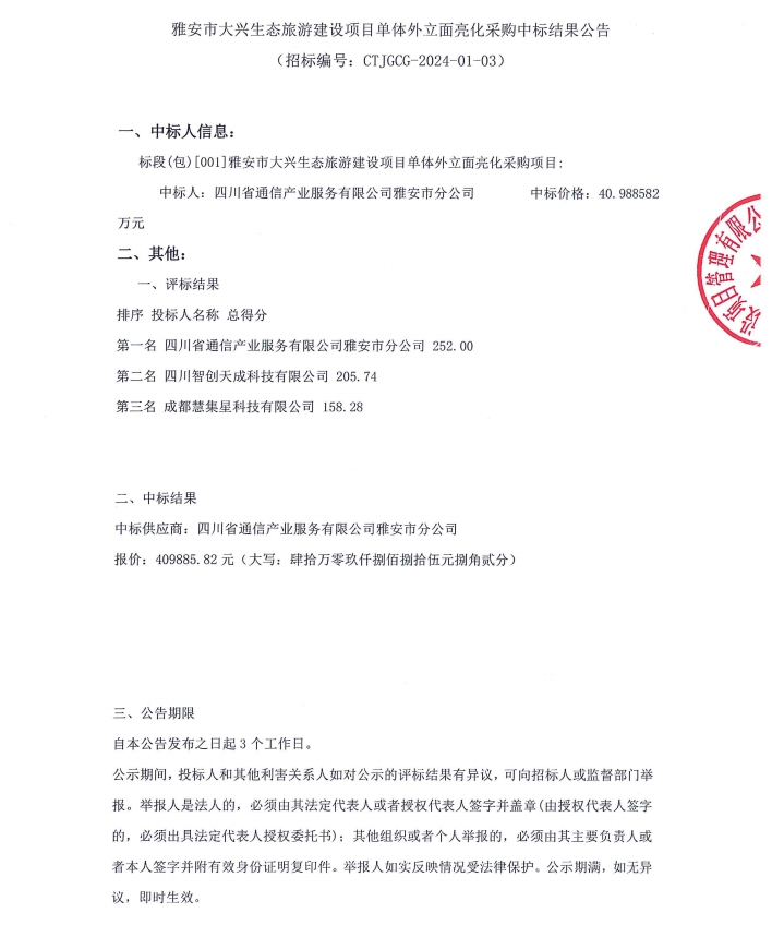 雅安市大興生態(tài)旅游建設(shè)項目單體外立面亮化采購中標(biāo)結(jié)果公告