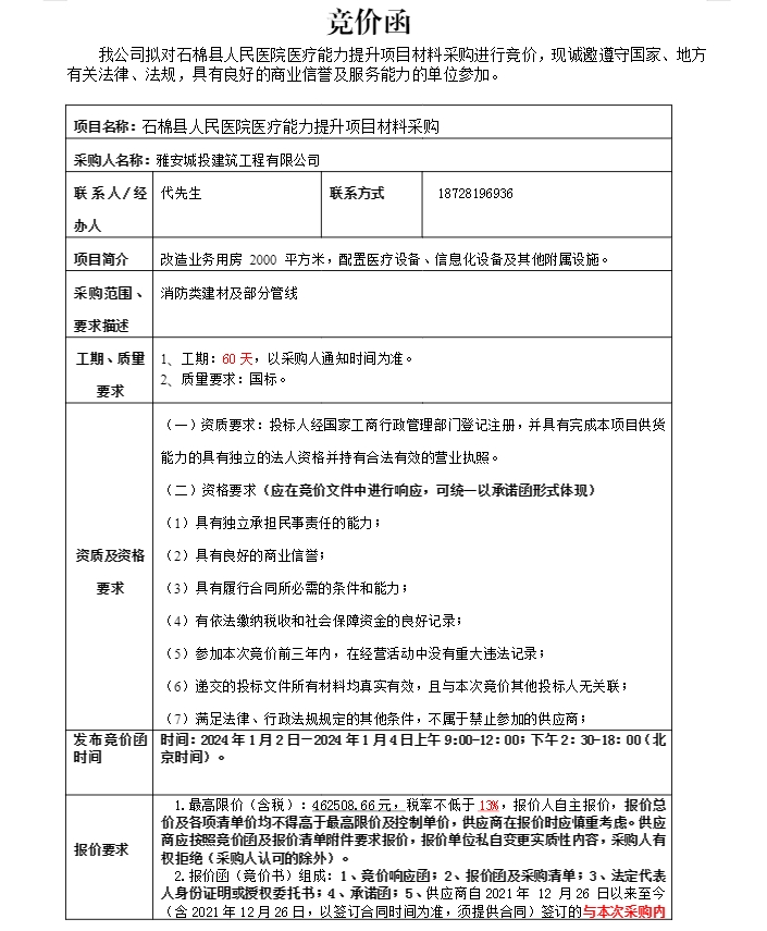 石棉縣人民醫(yī)院醫(yī)療能力提升項(xiàng)目消防材料(二次)采購競價(jià)公告