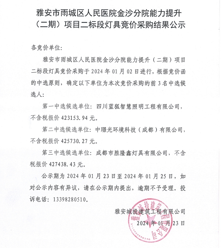 雅安市雨城區(qū)人民醫(yī)院金沙分院能力提升(二期)項(xiàng)目二標(biāo)段燈具競(jìng)價(jià)采購結(jié)果公示