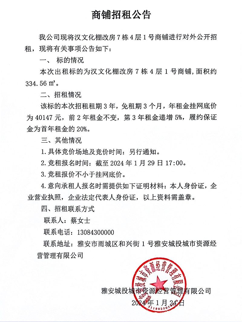 漢文化棚改房7棟4層1號商鋪招租公告