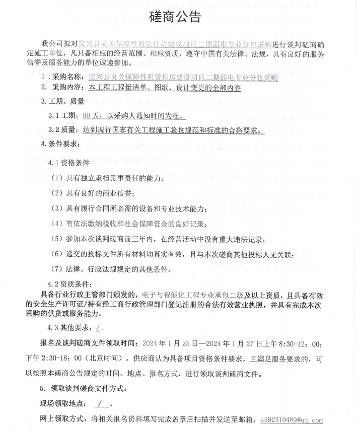 寶興縣靈關(guān)鎮(zhèn)保障性住房建設(shè)項(xiàng)目二期弱電專(zhuān)業(yè)分包采購(gòu)磋商公告