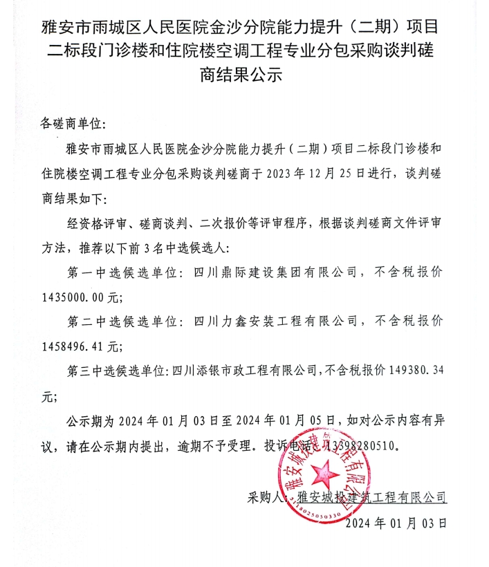 雅安市雨城區(qū)人民醫(yī)院金沙分院能力提升(二期)項(xiàng)目二標(biāo)段門診樓和住院樓空調(diào)工程專業(yè)分包采購談判磋商結(jié)果公示