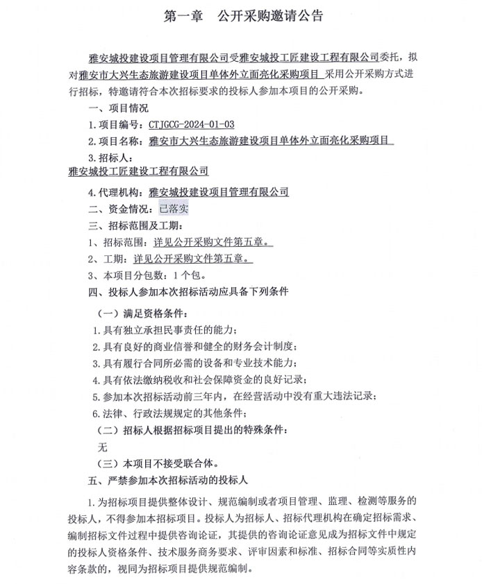 雅安市大興生態(tài)旅游建設(shè)項目單體外立面亮化采購項目公開采購邀請公告