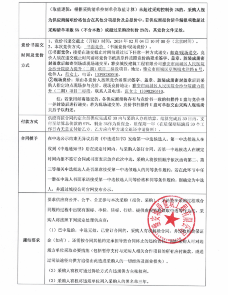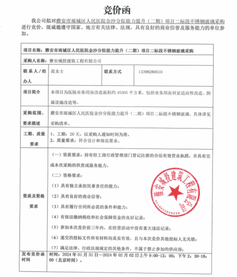 雅安市雨城區(qū)人民醫(yī)院金沙分院能力提升(二期)項目二標(biāo)段不銹鋼玻璃采購競價公告