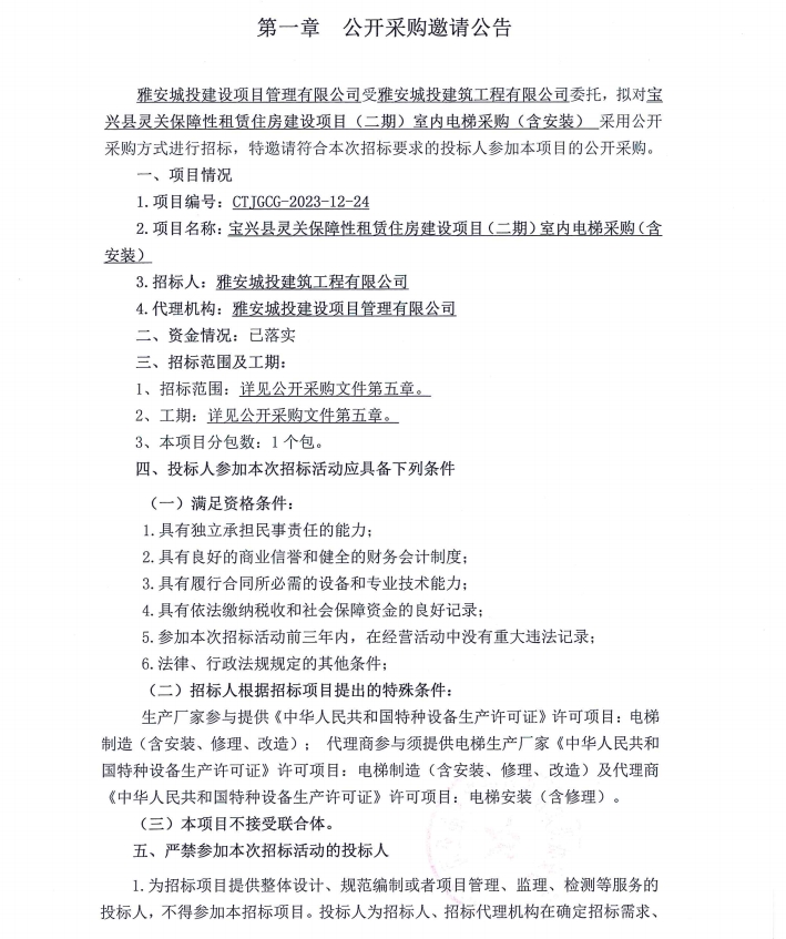 寶興縣靈關保障性租賃住房建設項目(二期)室內電梯采購(含安裝)公開采購邀請公告
