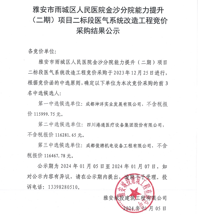 雅安市雨城區(qū)人民醫(yī)院金沙分院能力提升(二期)項目二標段醫(yī)氣系統(tǒng)改造工程競價采購結(jié)果公示