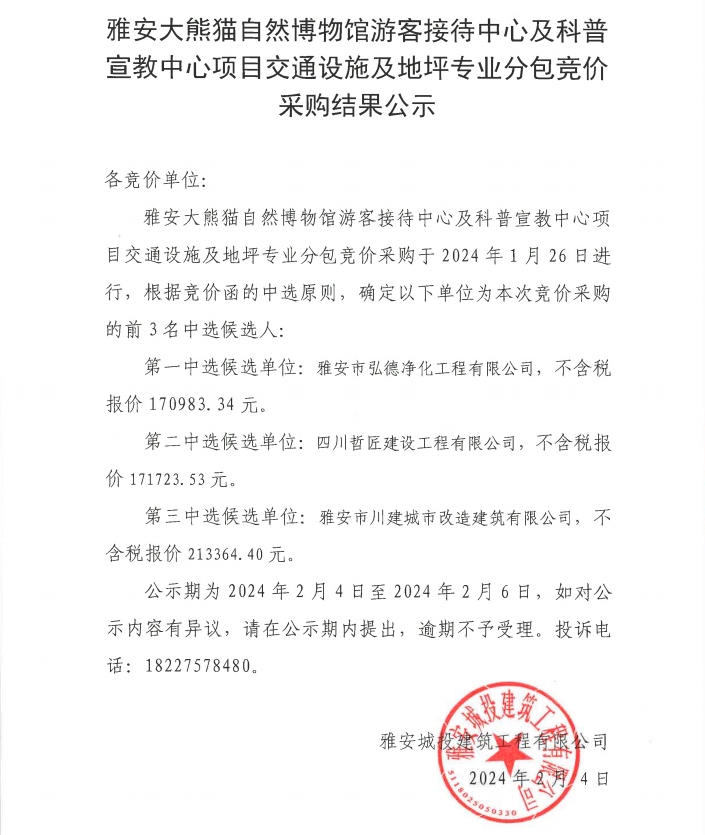 雅安市大熊貓自然博物館游客接待中心及科普宣教中心項目交通設(shè)施及地坪專業(yè)分包競價采購結(jié)果公示