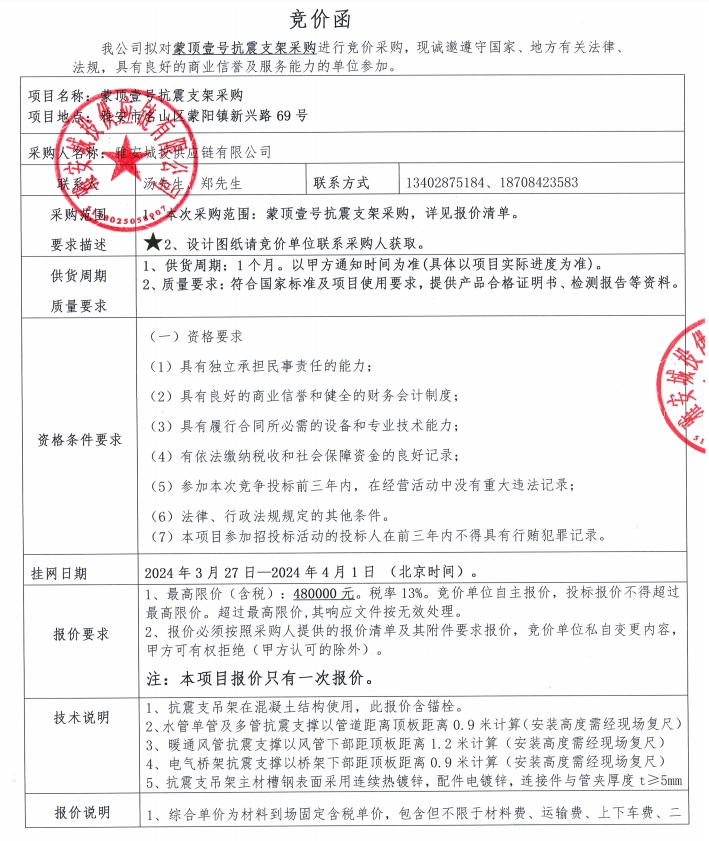 蒙頂壹號抗震支架采購競價(jià)公告