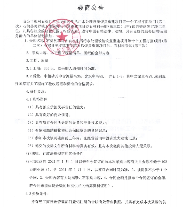 石棉縣草科鄉(xiāng)農(nóng)村生活污水處理設(shè)施恢復(fù)重建項(xiàng)目等十個(gè)工程打捆項(xiàng)目(第二次)、石棉縣美羅鎮(zhèn)衛(wèi)生院災(zāi)后恢復(fù)重建項(xiàng)目砂石材料采購(gòu)(第三次)磋商公告