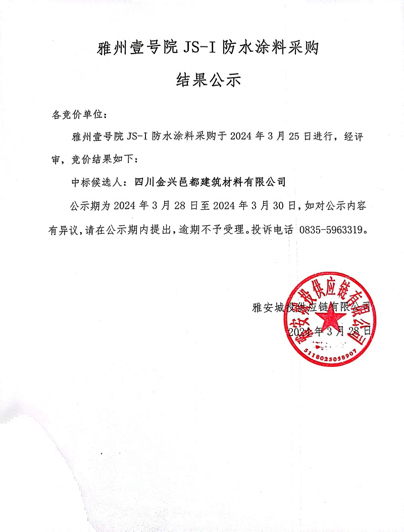 雅州壹號院JS-I防水涂料采購結(jié)果公示