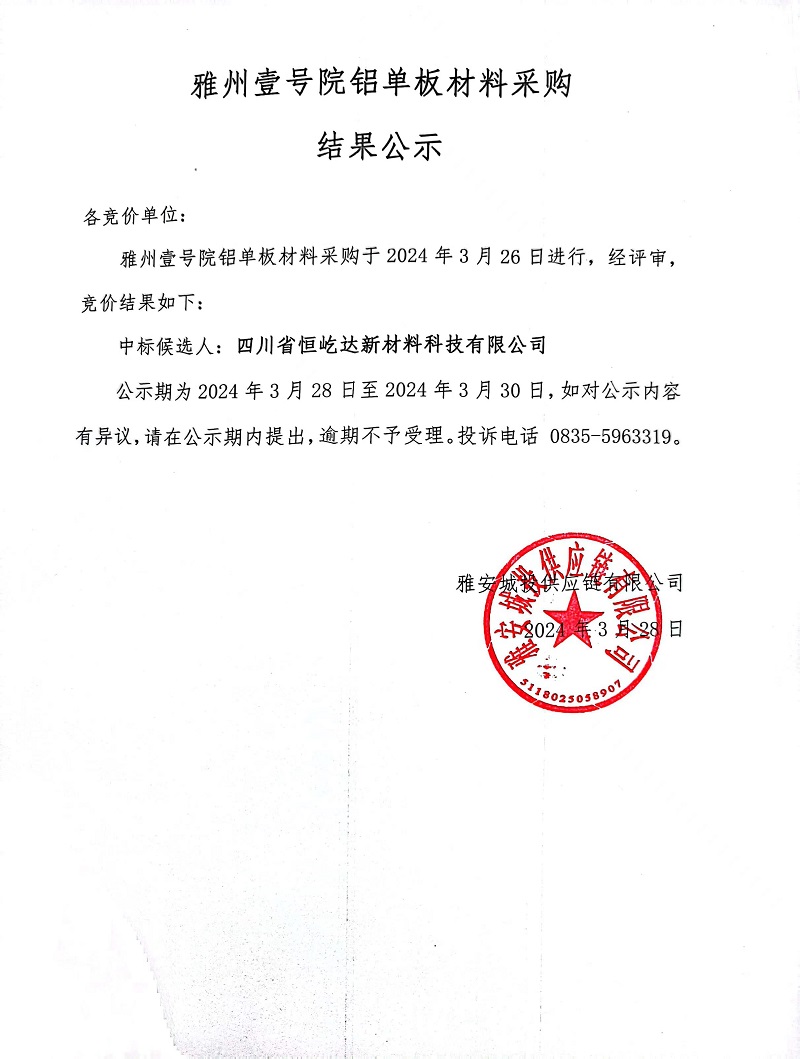 雅州壹號院鋁單板材料采購結(jié)果公示