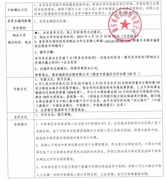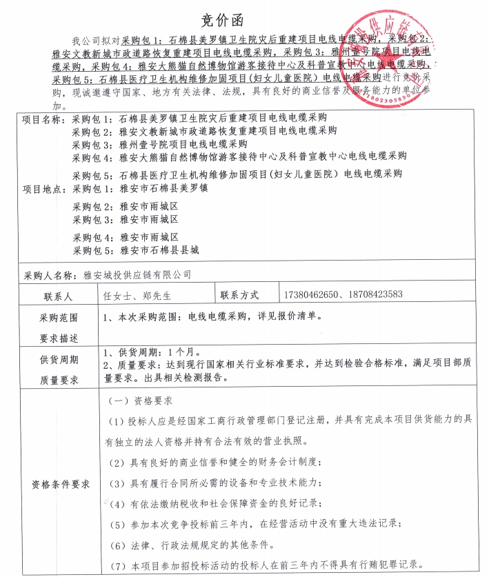 雅安城投供應鏈有限公司電線電纜采購競價公告