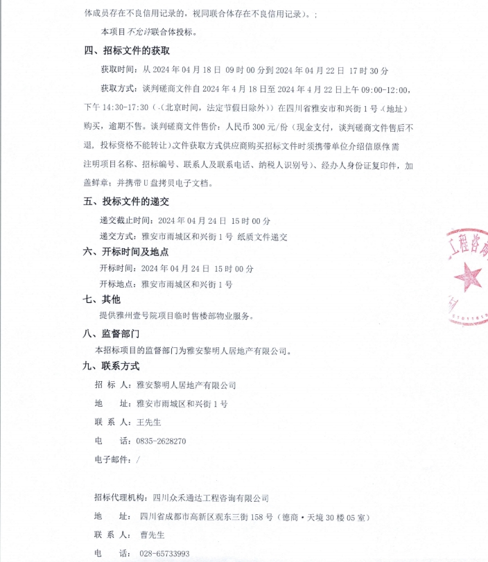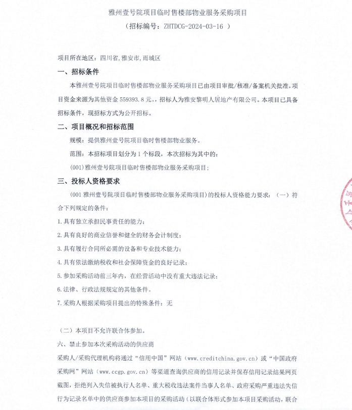 雅州壹號院項目臨時售樓部物業(yè)服務采購項目公告
