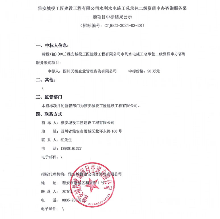 雅安城投工匠建設工程有限公司水利水電施工總承包二級資質(zhì)申辦咨詢服務采購項目中標結(jié)果公示
