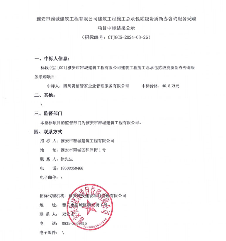 雅安市雅城建筑工程有限公司建筑工程施工總承包貳級資質(zhì)新辦咨詢服務(wù)采購項目中標結(jié)果公示