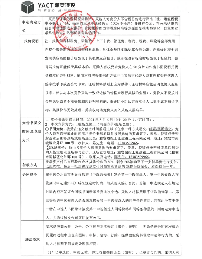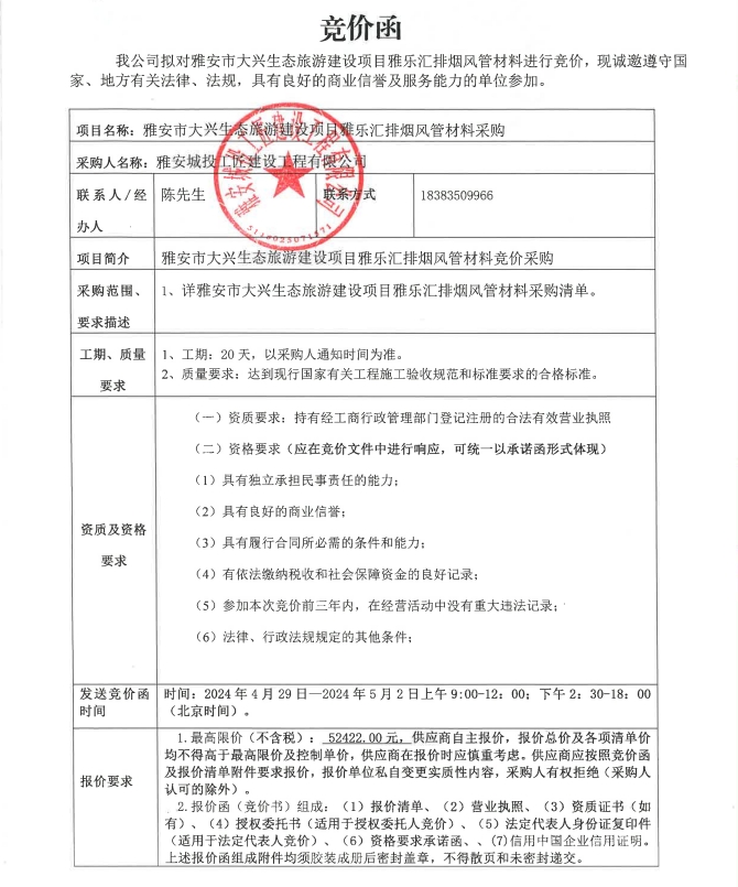 雅安市大興生態(tài)旅游建設(shè)項(xiàng)目雅樂匯排煙風(fēng)管材料采購競價公告