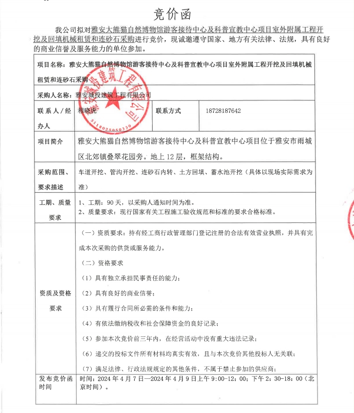 雅安大熊貓自然博物館游客接待中心及科普宣教中心項(xiàng)目室外附屬工程開挖及回填機(jī)械租賃和連砂石采購(gòu)競(jìng)價(jià)公告