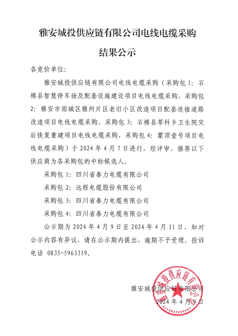 雅安城投供應(yīng)鏈有限公司電線電纜采購結(jié)果公示