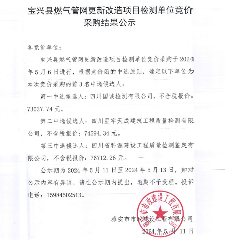 寶興縣燃氣管網(wǎng)更新改造項目檢測單位競采購結(jié)果公示