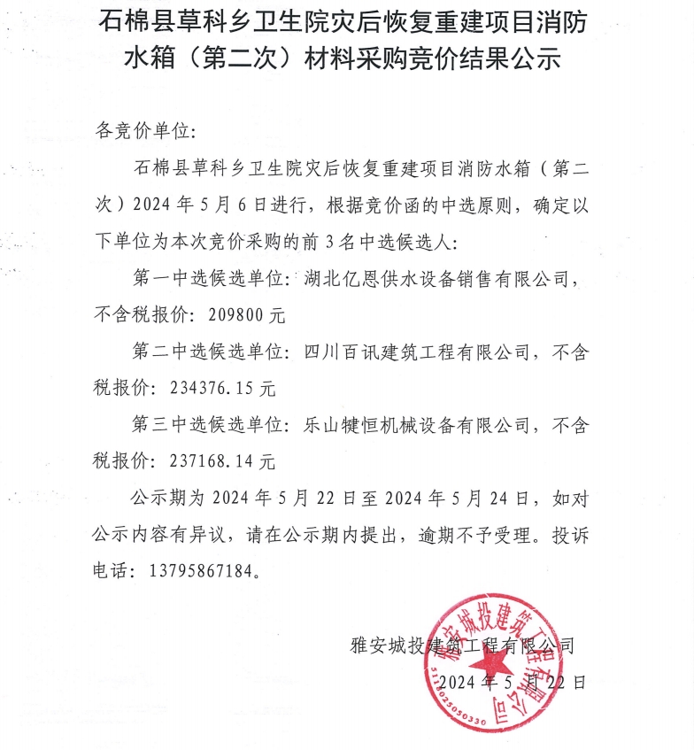 石棉縣草科鄉(xiāng)衛(wèi)生院災(zāi)后恢復(fù)重建項(xiàng)目消防水箱(第二次)材料采購競價(jià)結(jié)果公示