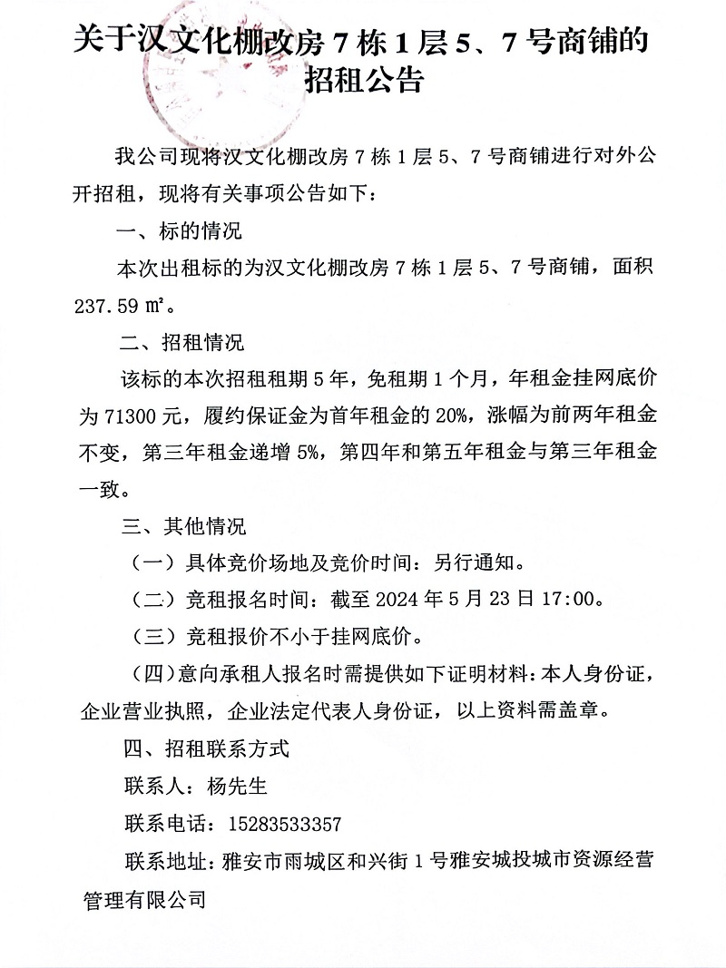 關(guān)于漢文化棚改房7棟1層5、7號商鋪的招租公告