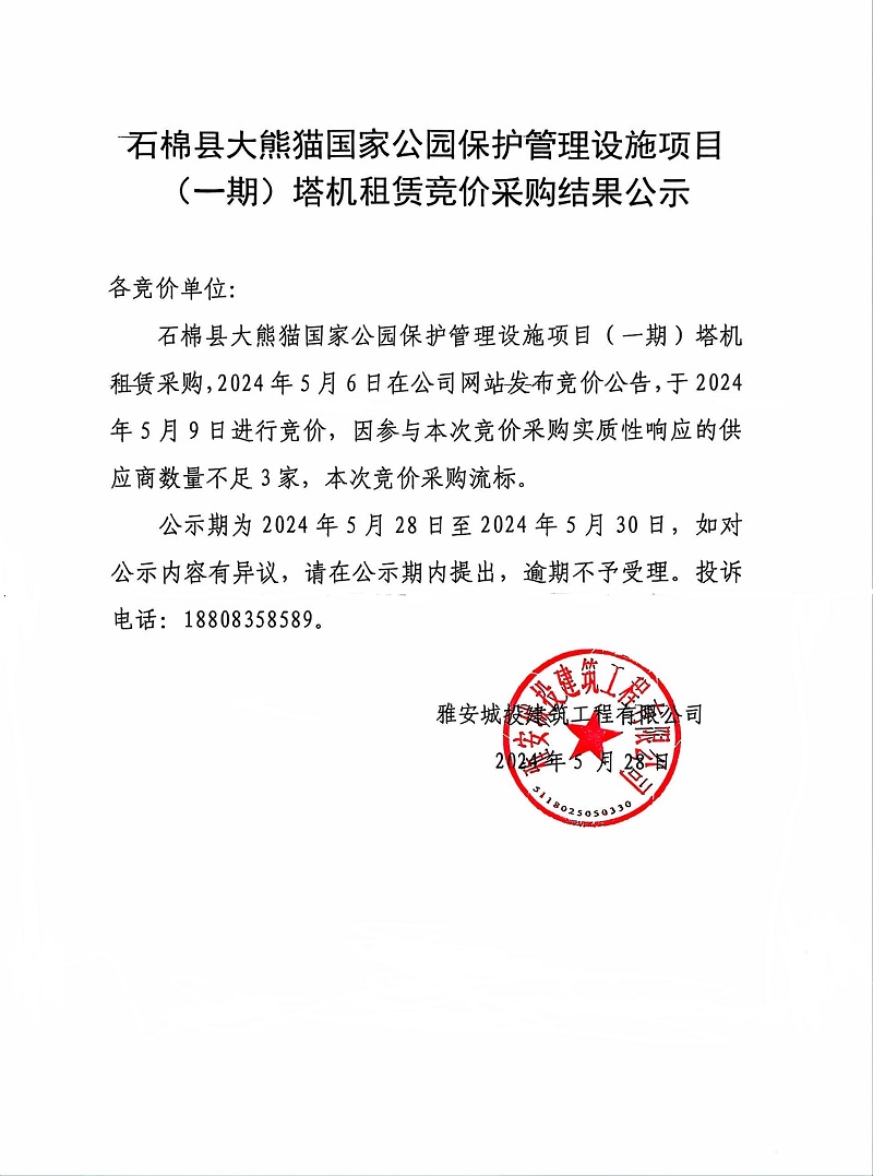 石棉縣大熊貓國家公園保護管理設施項目(一期)塔機租賃競價采購結果公示