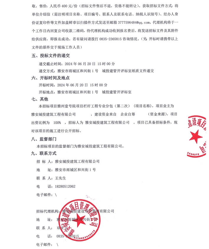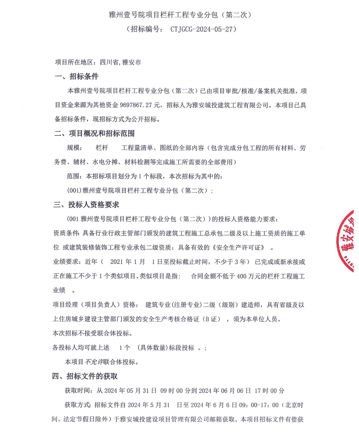 雅州壹號院項(xiàng)目欄桿工程專業(yè)分包(第二次)公告