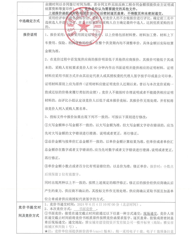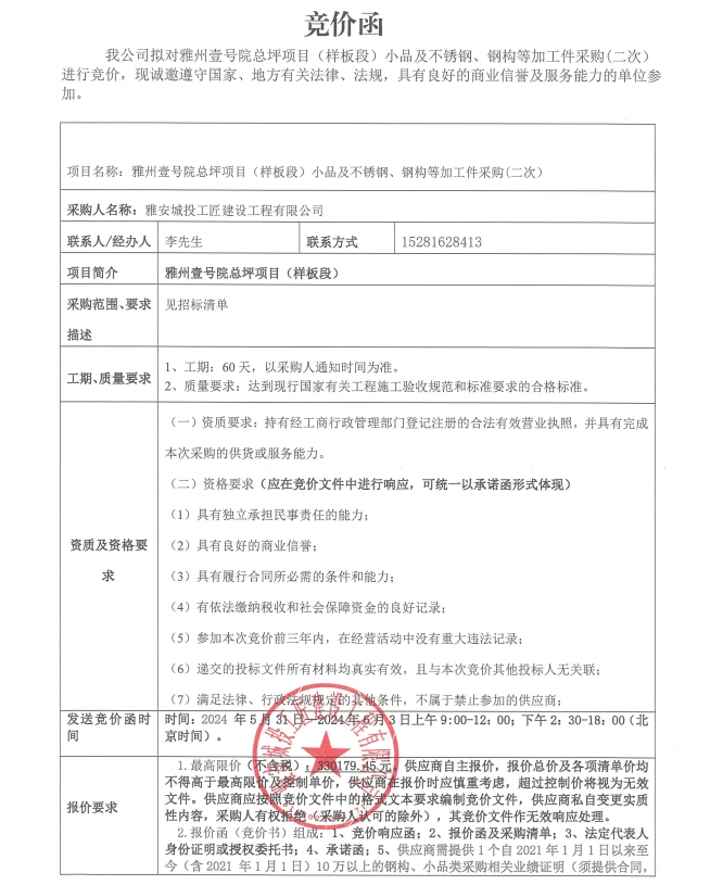 雅州壹號院總坪項目(樣板段)小品及不銹鋼、鋼構等加工件的采購競價函