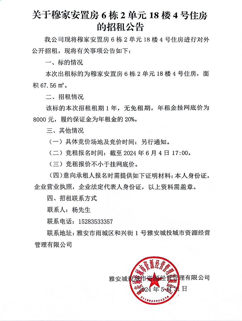 關(guān)于穆家安置房6棟2單元5樓4號(hào)住房的招租公告