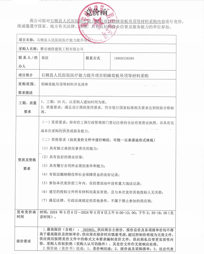 石棉縣人民醫(yī)院醫(yī)療能力提升項(xiàng)目鋁蜂窩板吊頂?shù)炔牧喜少弮?nèi)容競價(jià)公告