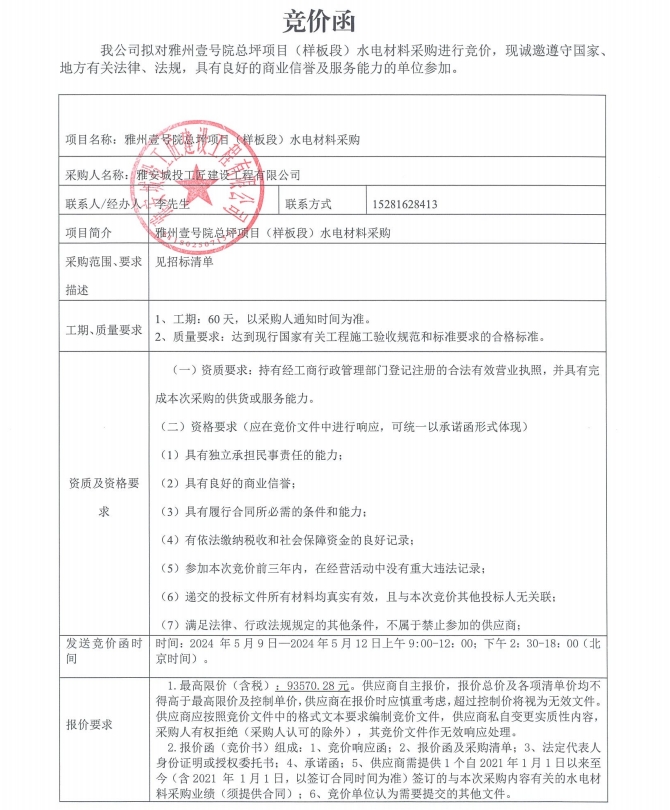 雅州壹號院總坪項(xiàng)目(樣板段)水電材料采購競價公告