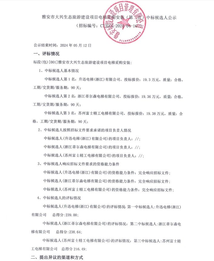 雅安市大興生態(tài)旅游建設項目電梯采購安裝(第二次)中標候選人公示