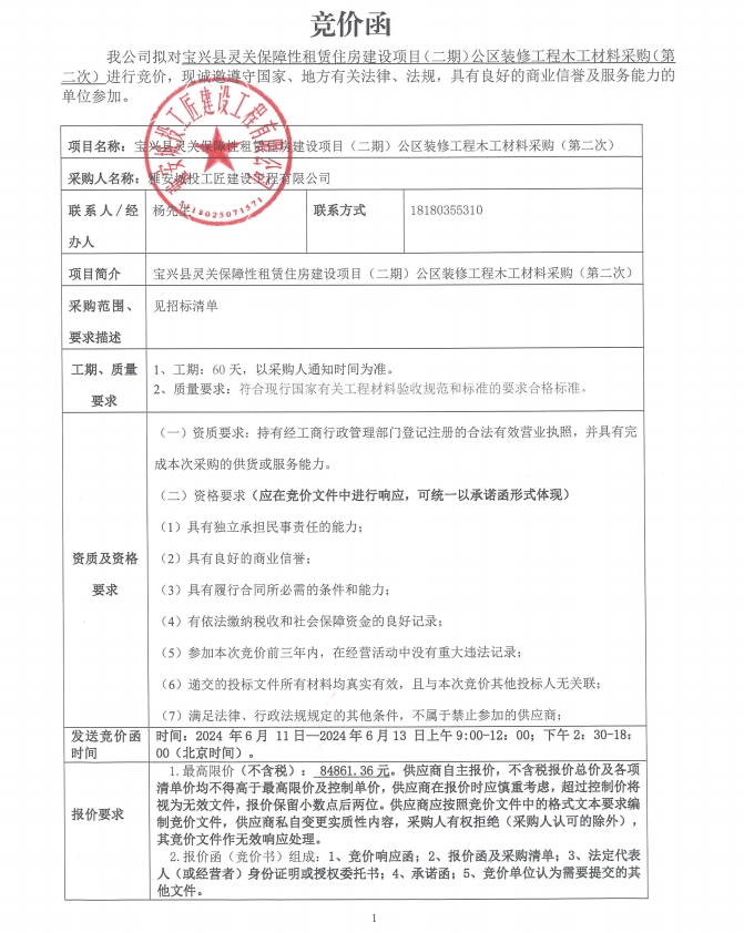 寶興縣靈關(guān)保障性租賃住房建設(shè)項(xiàng)目(二期)公區(qū)裝修工程木工材料采購(第二次)競價(jià)公告