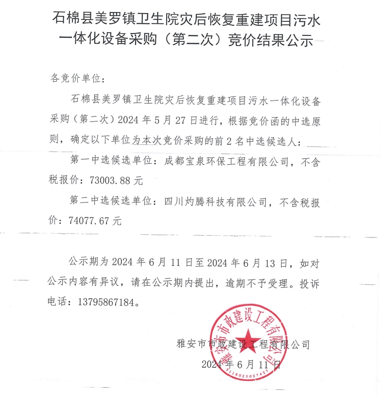 石棉縣美羅鎮(zhèn)衛(wèi)生院災(zāi)后恢復(fù)重建項(xiàng)目污水一體化設(shè)備材料采購(第二次)競價(jià)結(jié)果公示
