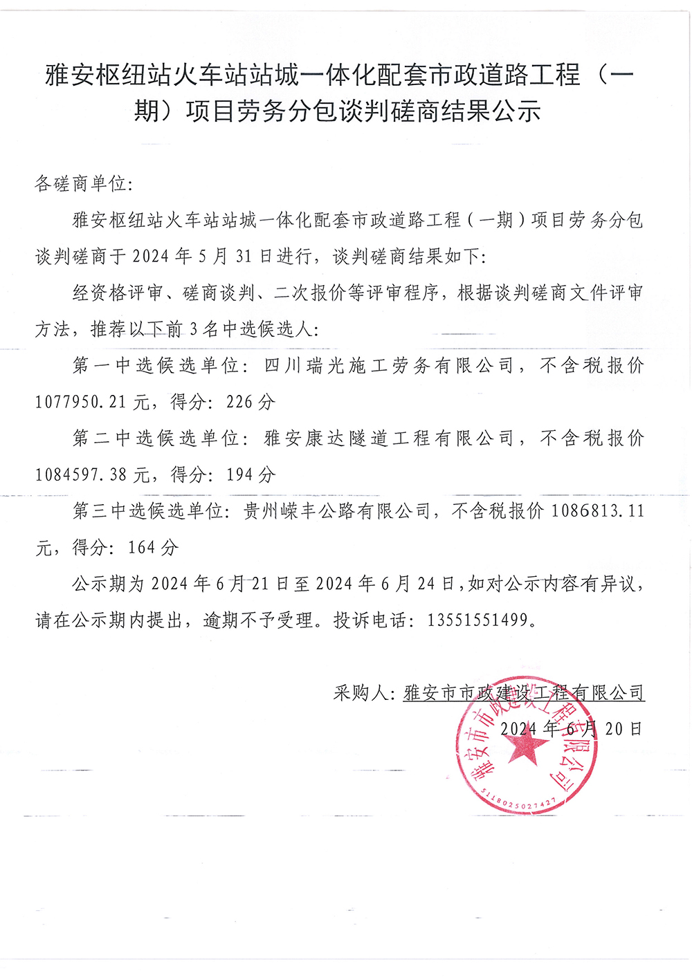 雅安樞紐站火車站站臺一體化配套市政道路工程(一期)項目勞務(wù)分包談判磋商結(jié)果公示