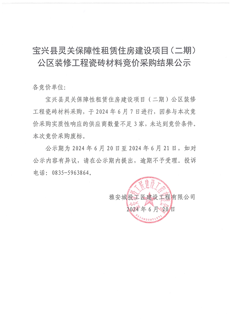 寶興縣靈關(guān)保障性租賃住房建設(shè)項(xiàng)目(二期)公區(qū)裝修工程瓷磚材料競(jìng)價(jià)采購(gòu)結(jié)果公示