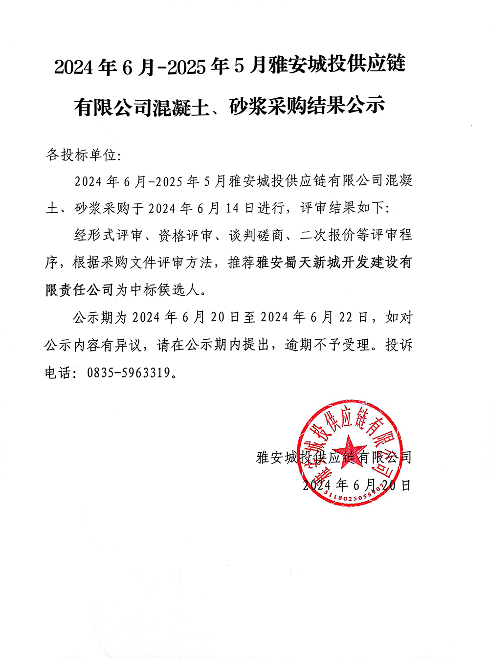 2024年6月-2025年5月雅安城投供應鏈有限公司混凝土、砂漿采購結(jié)果公示