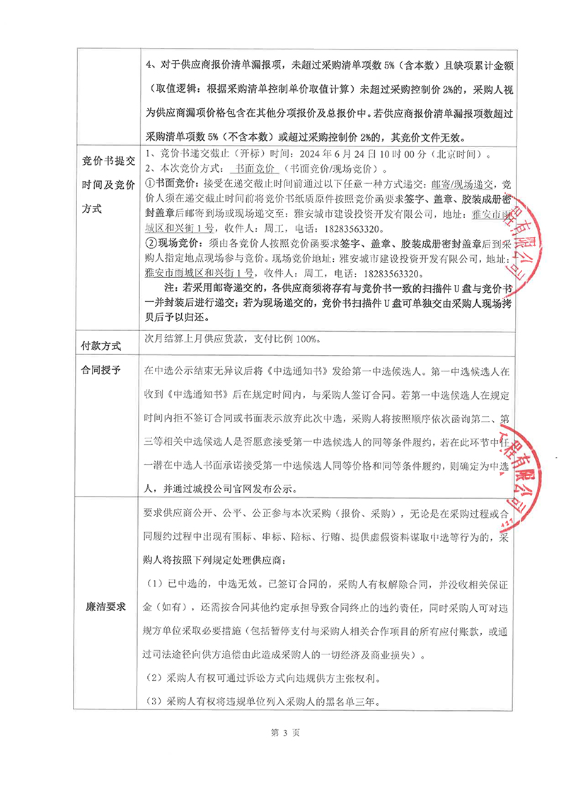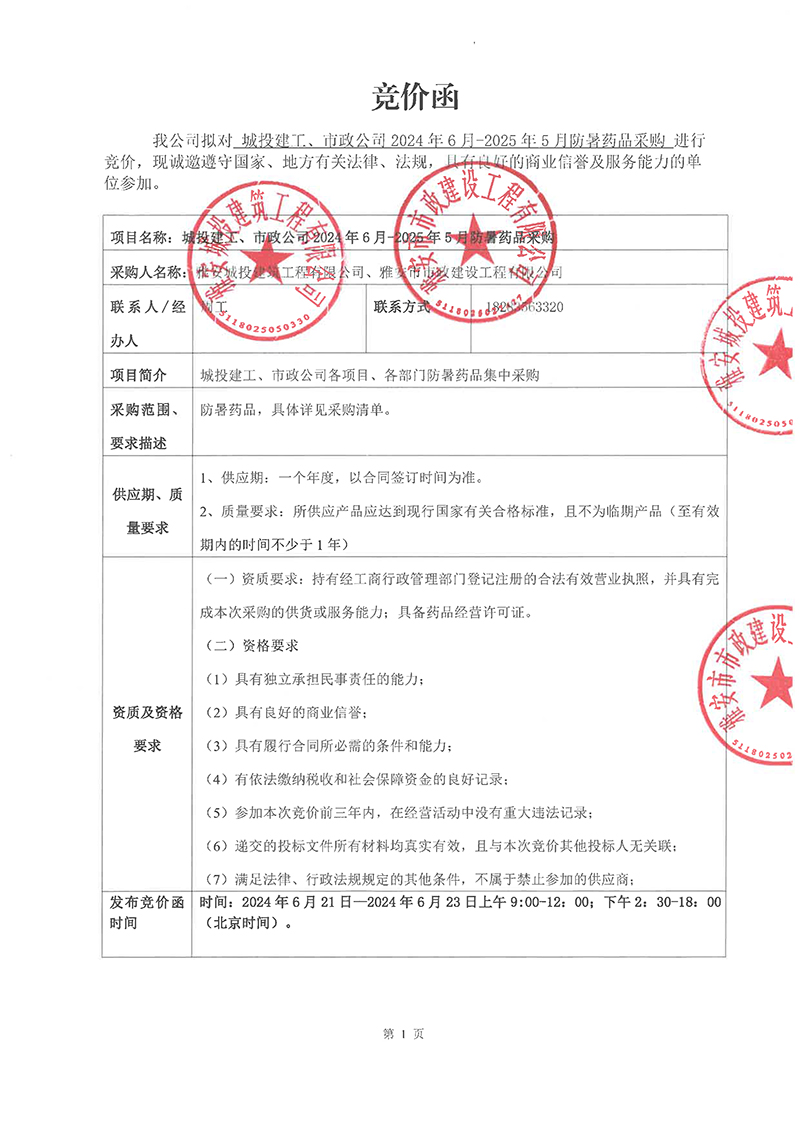 城投建工、市政公司2024年6月-2025年5月防暑藥品采購競價(jià)函