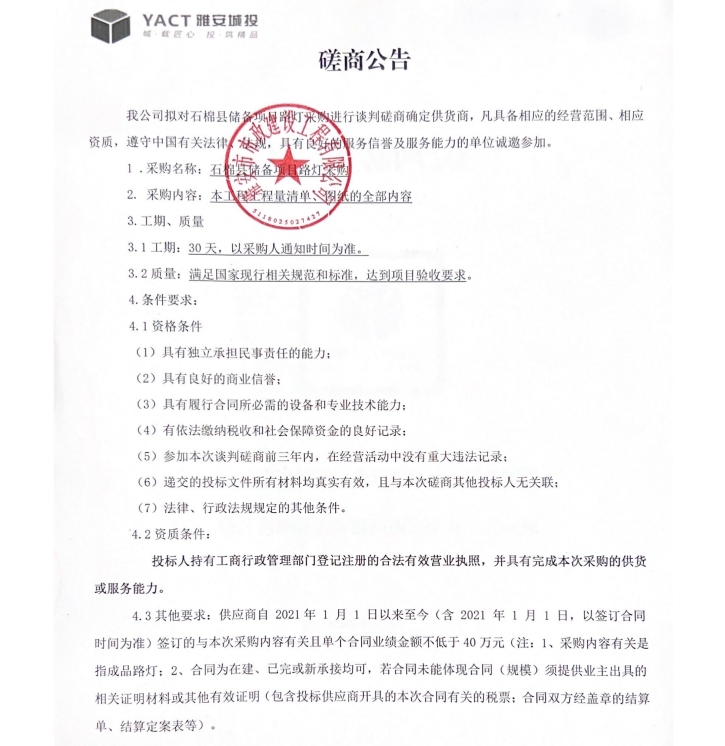 石棉縣儲備項(xiàng)目路燈采購談判磋商公告