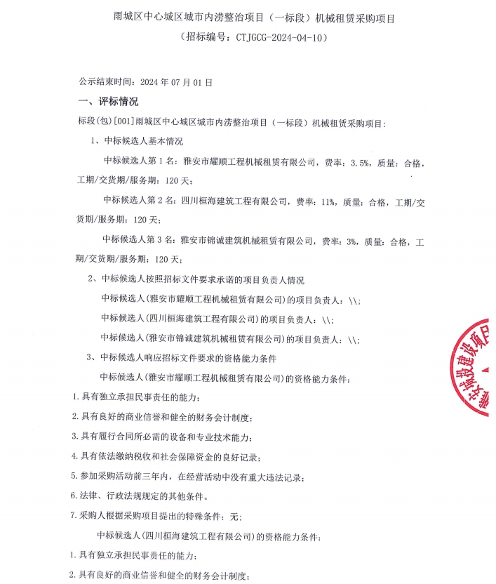 雨城區(qū)中心城區(qū)城市內(nèi)澇整治項(xiàng)目(一標(biāo)段)項(xiàng)目機(jī)械租賃采購(gòu)項(xiàng)目公示