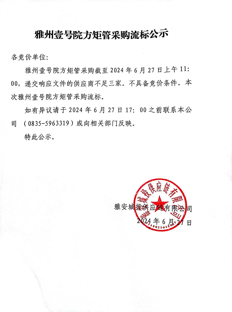 雅州壹號(hào)院方矩管采購(gòu)流標(biāo)公示